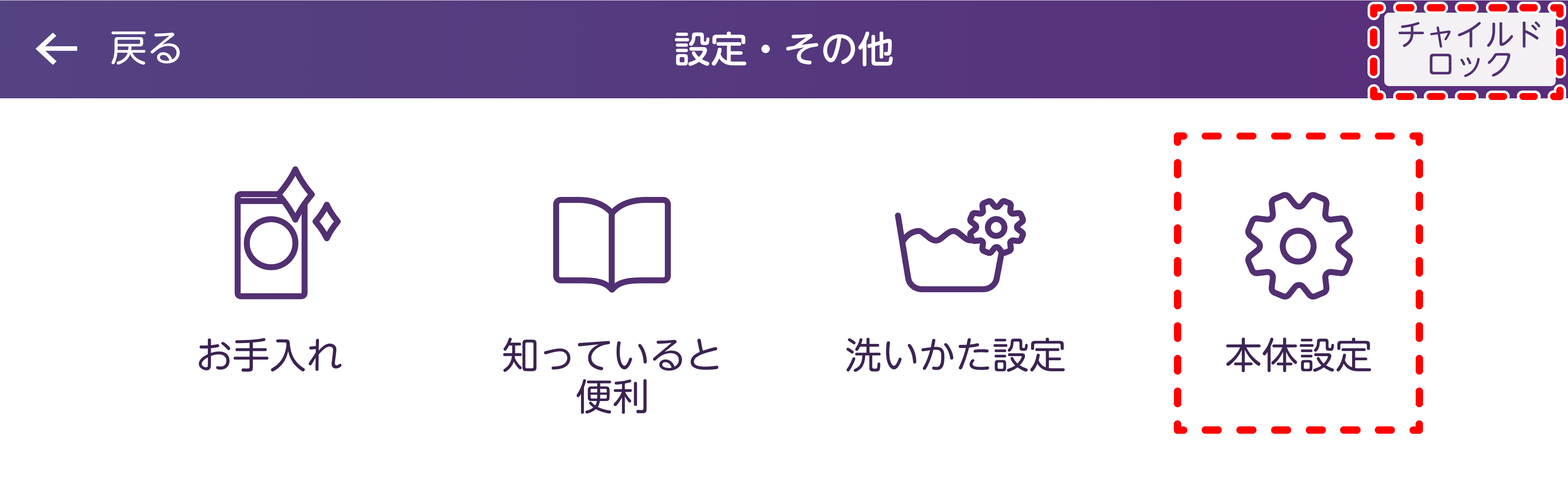 2.本体タッチパネルの「本体設定」または「チャイルドロック」を押します 。