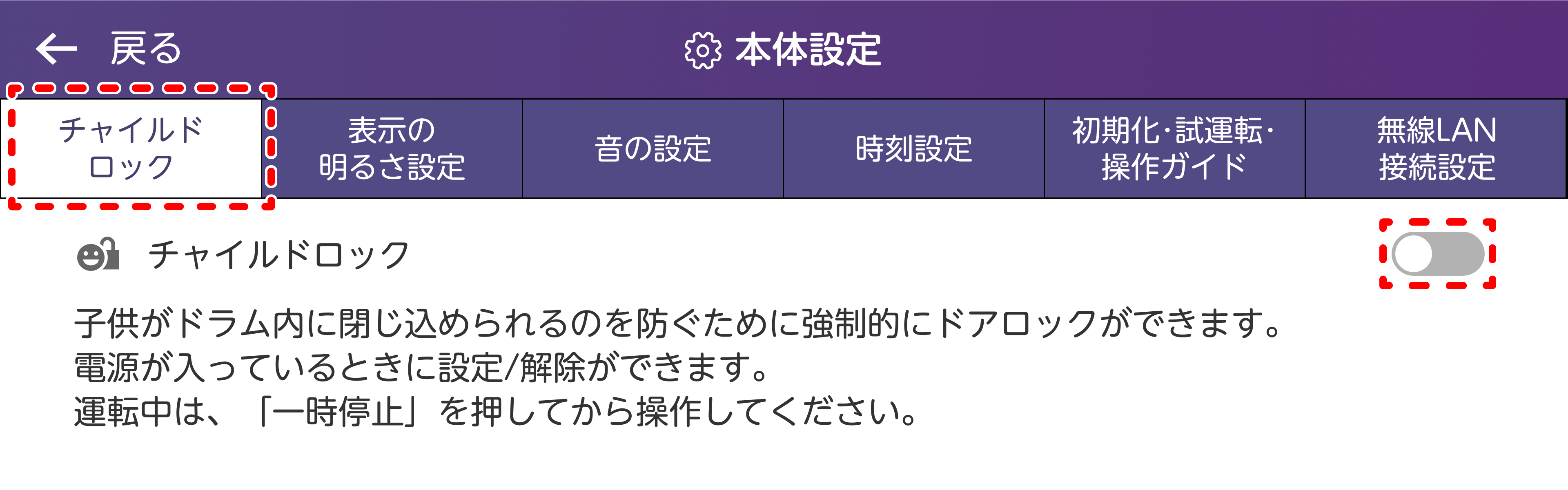 3.「チャイルドロック」を選び、ボタンを「ON」にすることで設定できます。設定後は、「戻る」を押して画面を戻します。